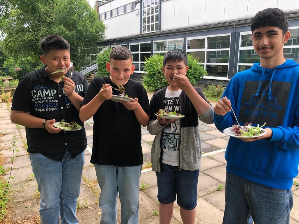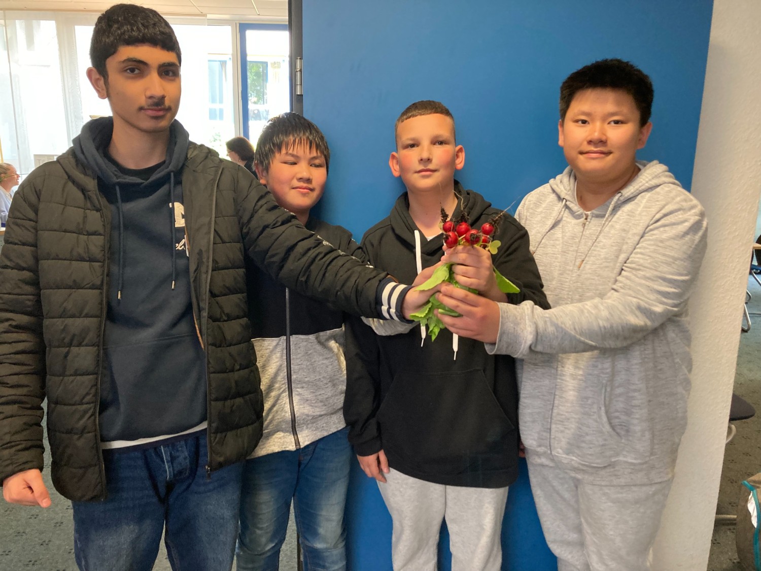 Ein großes Team hatte sich also aufgemacht, um den Start für erste Teile eines Schulgartens an der Bertha zu realisieren. Und die Mühe hat sich sogar gelohnt, denn viele bunte Blumen blühten nach einiger Zeit und auch die Ernte in den Hochbeeten konnte sich sehen lassen und schmeckte allen wirklich gut!