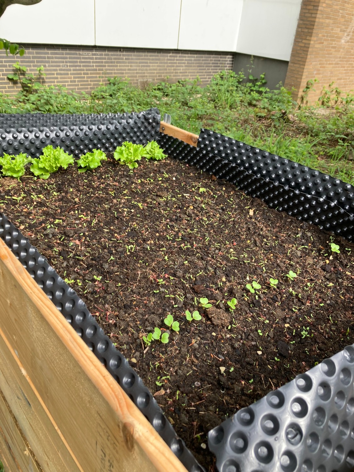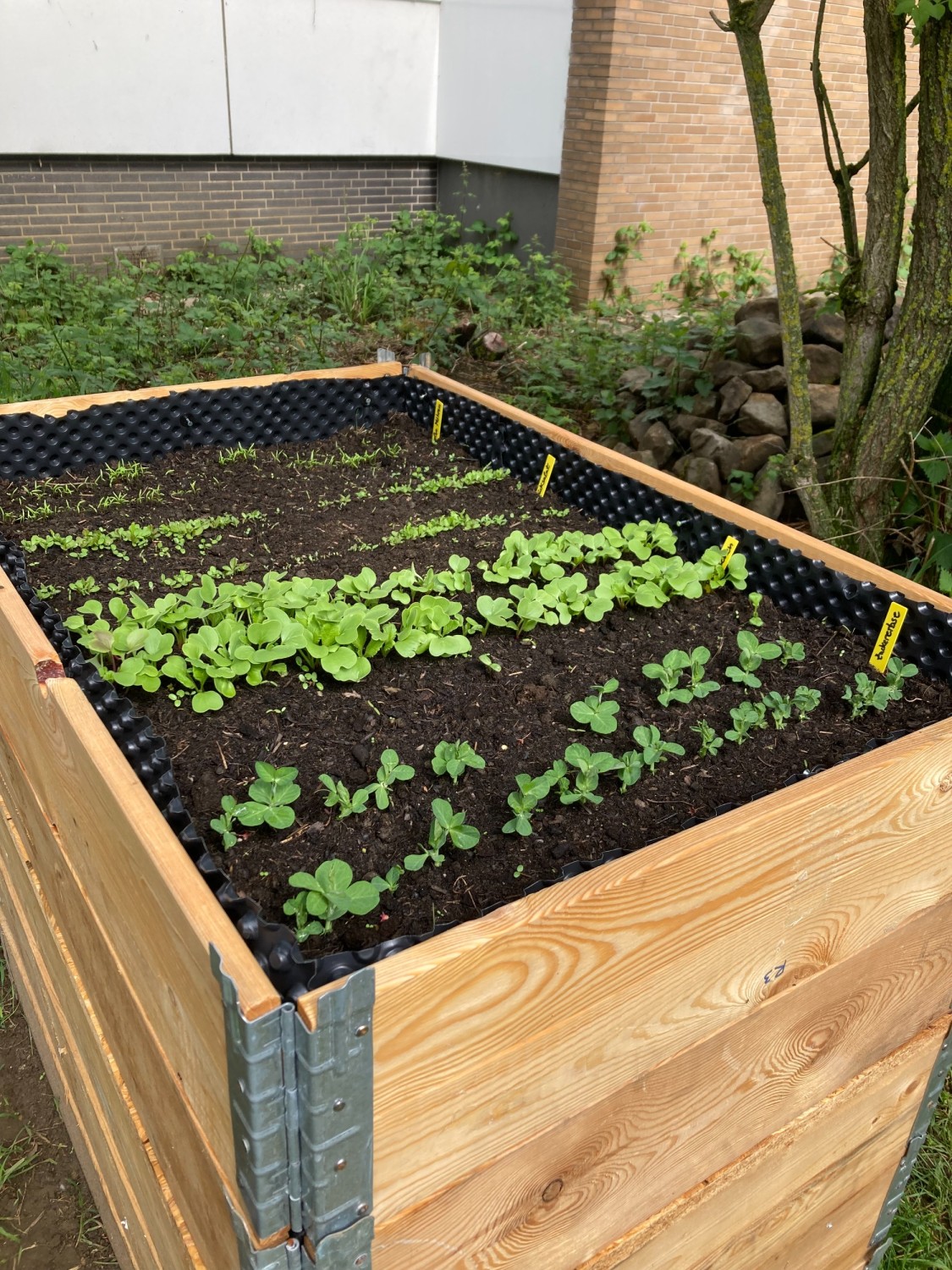 Das Befüllen der Hochbeete war gar nicht so einfach, denn dafür mussten schon alle ganz schon kräftig anpacken. Aber die Mühe lohnte sich sehr schnell, denn schon nach kurzer Zeit sah man die ersten Pflanzen wachsen. In diesem Jahr hatten wir uns für Radieschen/Zuckererbsen/Pflücksalat und Möhren entschieden. Auch Frau Springmeyer sorgte mit ihrem WPK für mehr Vielfalt im Garten der Ruhe, denn sie säte mit ihren Schülerinnen und Schülern in ganz viele Blumenkästen verschiedene Saatgutmischungen.