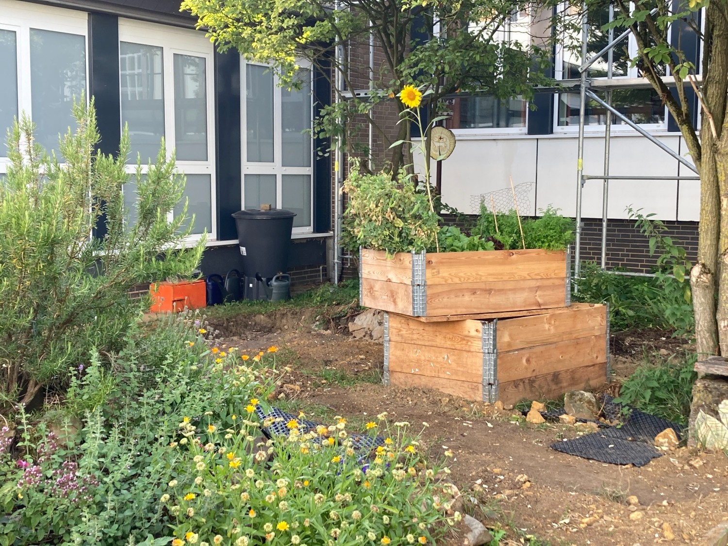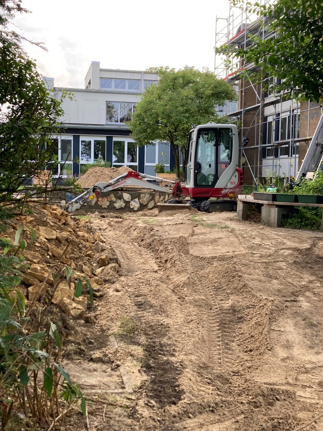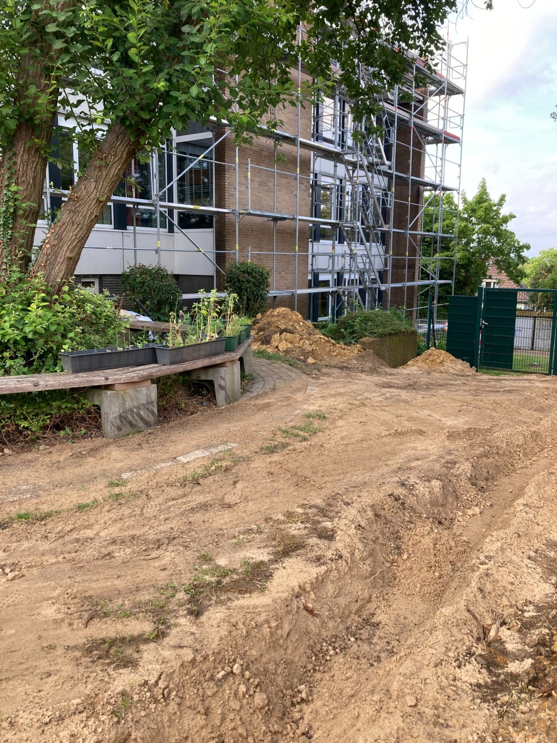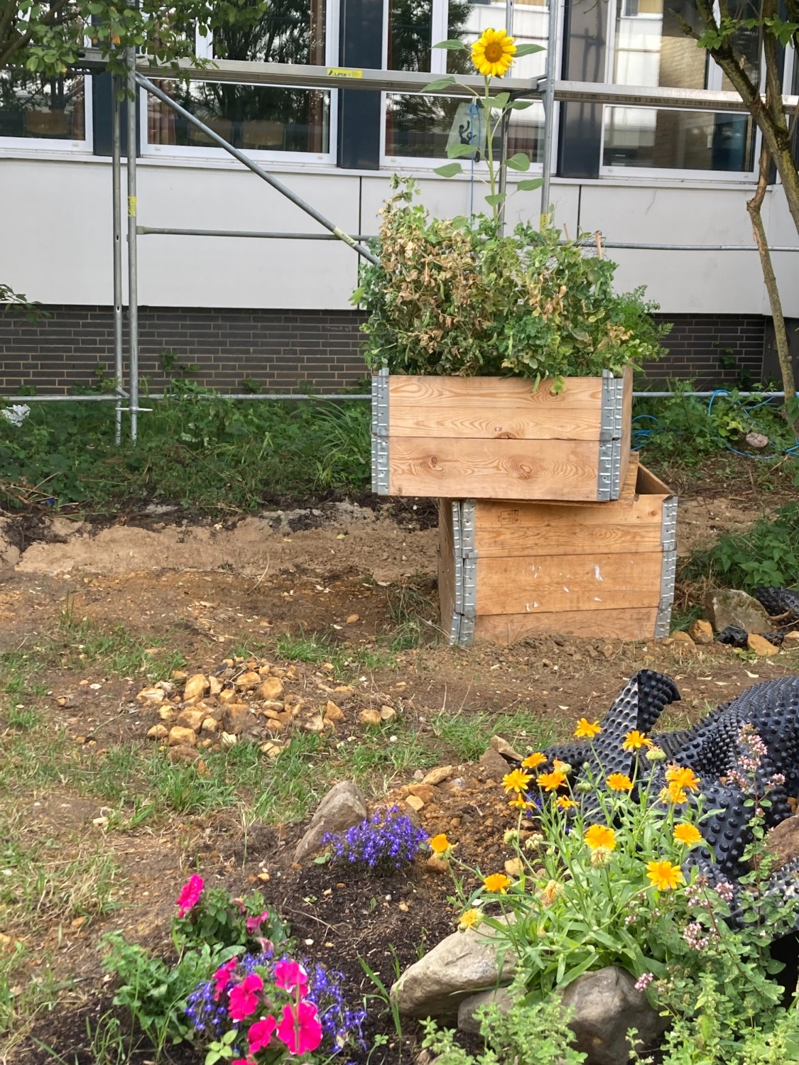 Für das regelmäßige Gießen wurden Absprachen getroffen, eine Regentonne aufgestellt und sogar für die Versorgung der Pflanzen in den Ferien war mit vereinten Kräften gesorgt worden. Was wir allerdings nicht bedacht hatten, waren die doch recht ausufernden Baumaßnahmen, die auch den Garten der Ruhe betreffen sollten. Gleich zu Anfang der Sommerferien wurden große Gerüste aufgebaut, Bagger zogen tiefe Gräben und unsere Hochbeete wurde ausgeschüttet, abgebaut oder umgestellt und im letzten Moment vor dem Aus gerettet. Tja, da war die Enttäuschung schon deutlich zu spüren, aber die Sonnenblume im verbliebenen Hochbeet ließ sich nicht beirren und wuchs und blühte in dem ganzen Chaos einfach weiter.