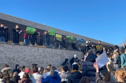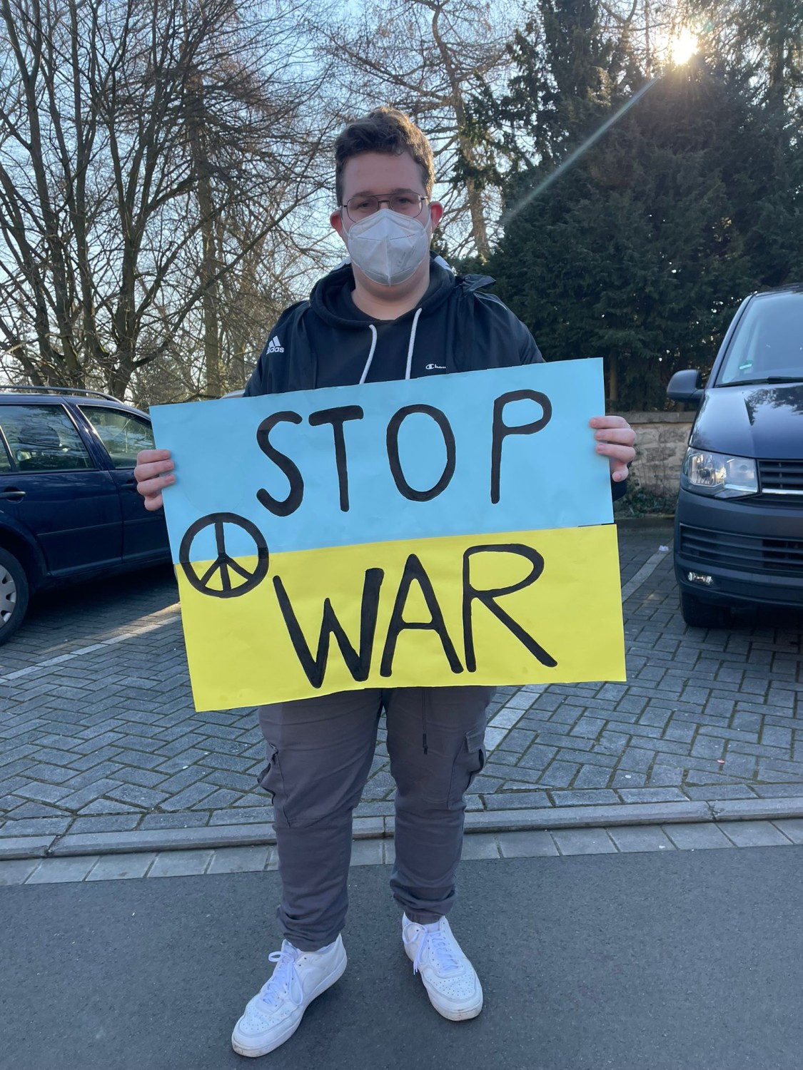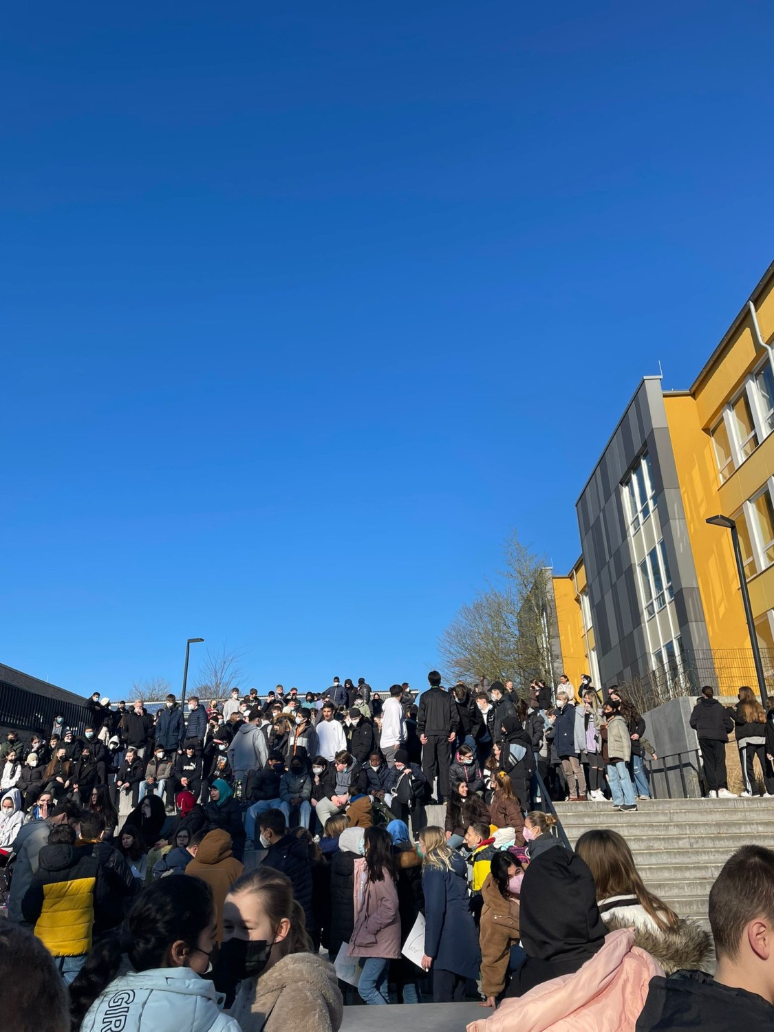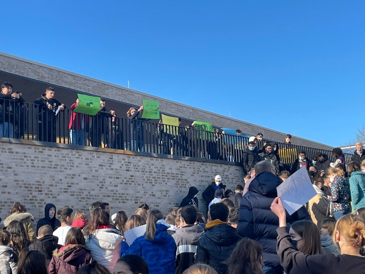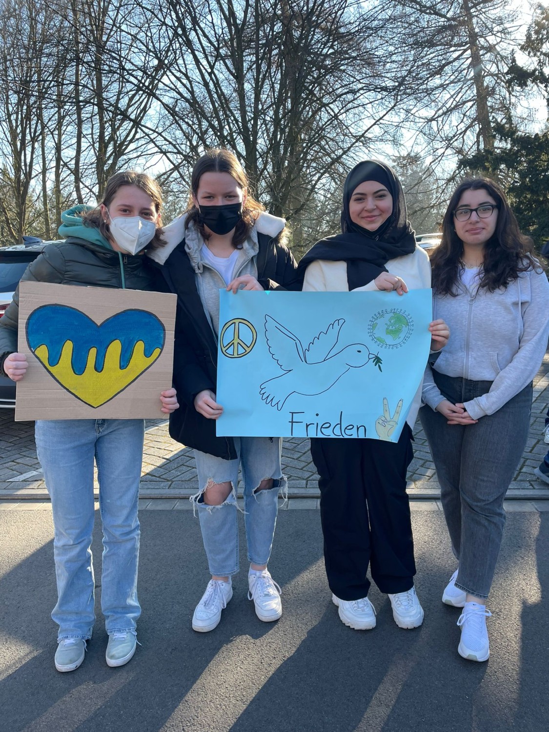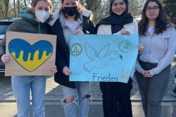 Die Bertha-von-Suttner-Oberschule Osnabrück steht – und das nicht nur wegen ihrer Namensgeberin – für den Frieden auf der ganzen Welt! Wir als Schulgemeinschaft solidarisieren uns mit allen Opfern des kriegerischen Konflikts in der Ukraine und verurteilen den gewaltsamen Einmarsch zutiefst.Um dieser Botschaft Nachdruck zu verleihen, haben sich heute um 10:00 Uhr alle Mitglieder*innen der Schule zu einem gemeinsamen Gedenken und zum Sendendieser Friedensbotschaft versammelt. Unser Schulleiter Herr Sandkämper erklärte in einer Ansprache, dass die BvS für „Frieden,Gleichberechtigung und Völkerverständigung“ steht. Die Schülervertretung untermalte dies durch Friedensplakate auf unterschiedlichen Sprachen, die dieVerbundenheit der Schüler*innen mit der Ukraine und der ganzen Welt symbolisierte. Sie erinnerte gleichzeitig an das berühmte Buch von Bertha von Suttner „Die Waffennieder!“ und richtete den Titel als Appell an die Welt.