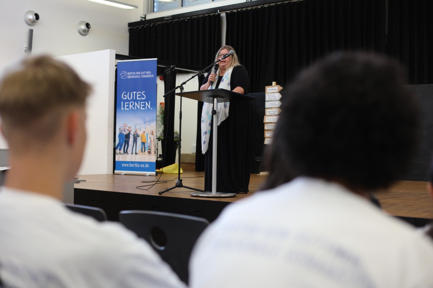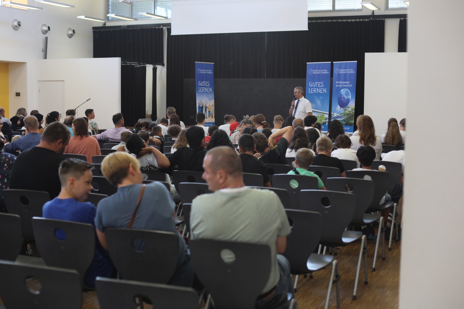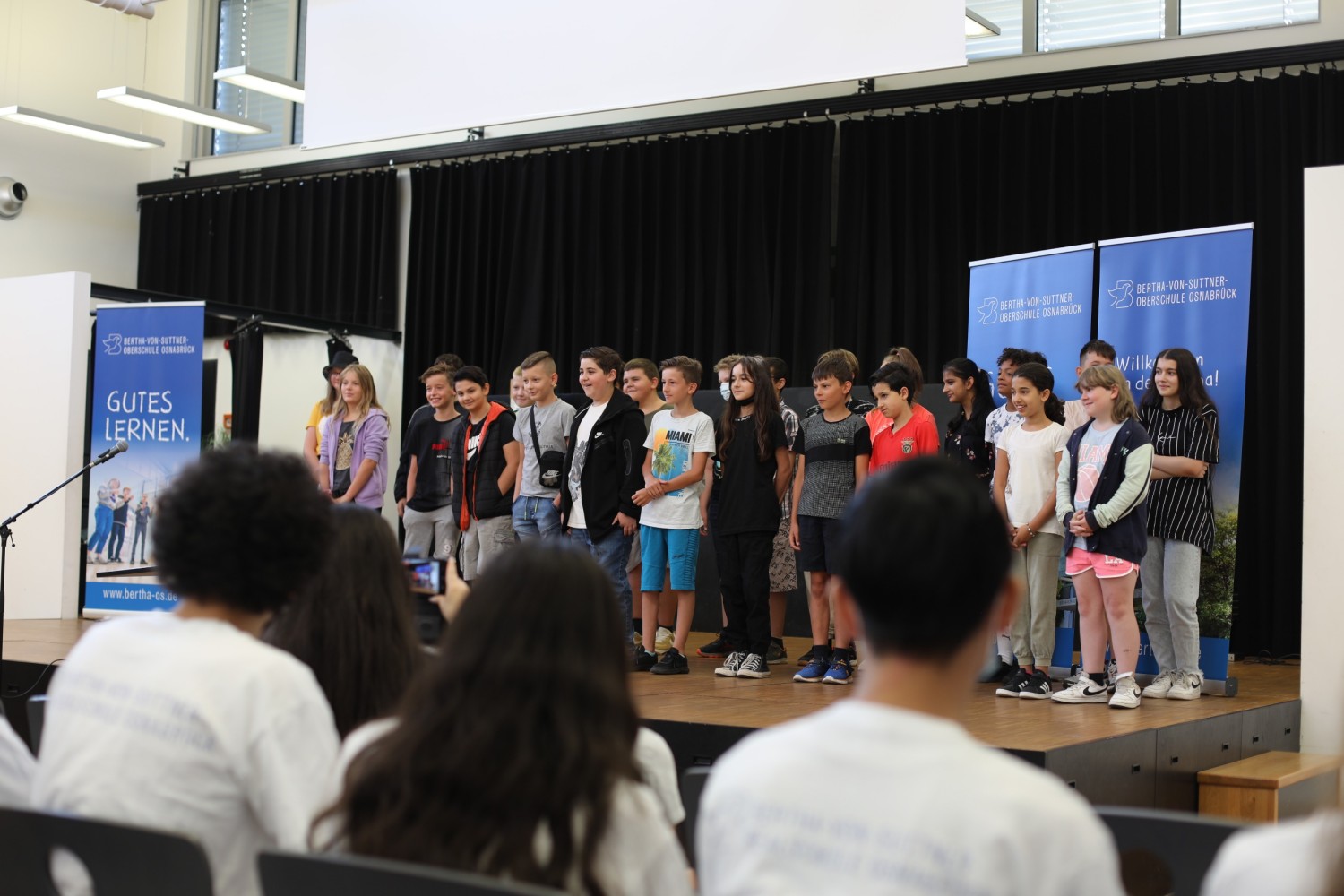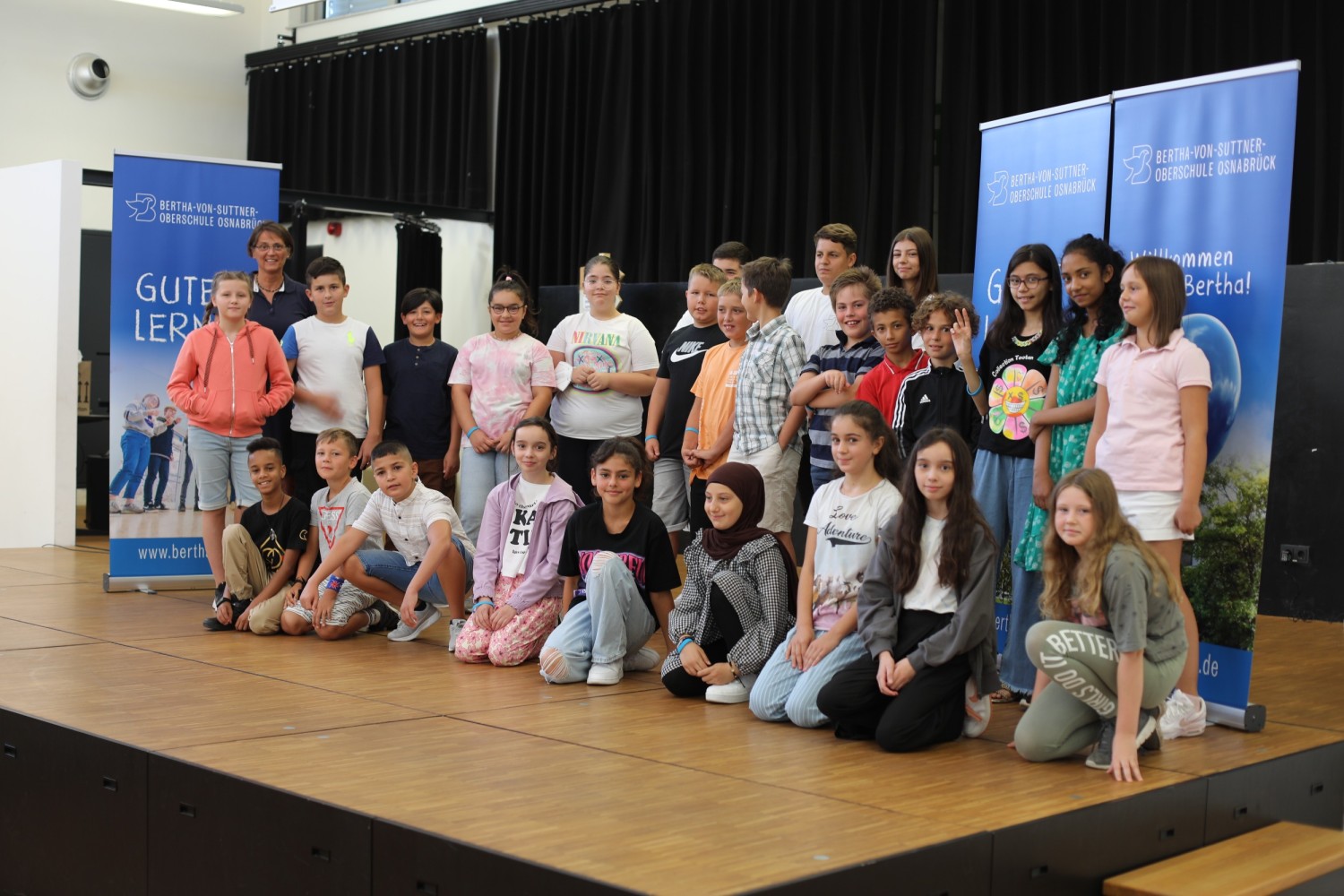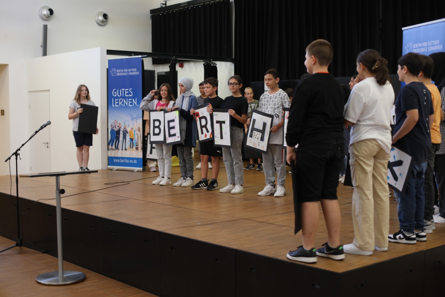 "Schön, dass ihr da seid!" - Treffender lässt sich kaum beschreiben, mit welcher Freude die neuen Fünftklässler von der Schulgemeinschaft begrüßt und in "ihre Bertha" aufgenommen wurden. So startete sichtlich erfreut unser Schulleiter, Herr Sandkämper, die Begrüßungsfeier mit freundlichen und auffordernden Worten. Die neuen Berthanerinnen und Berthaner sind eingeladen langsam mit ihrer neuen Schule zusammenzuwachsen. Dabei behilflich werden neben der Konrektorin Frau Herr Heller und dem diadaktischen Leiter Herr Fißmeyer auch ganz besonders die Mitglieder des Beratungsteams unserer Schule sein, die sich ebenfalls an diesem besonderen Freitag vorstellten.