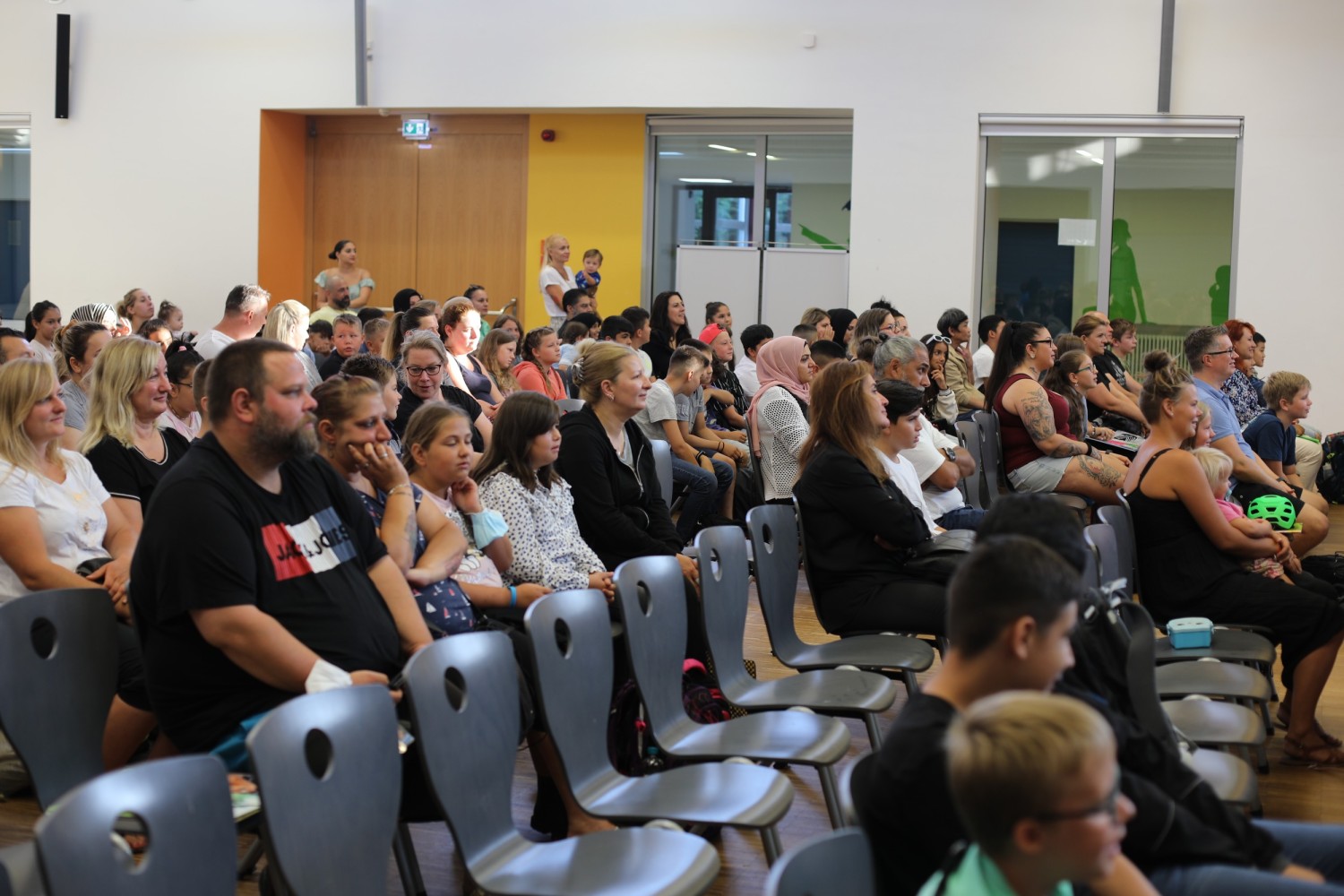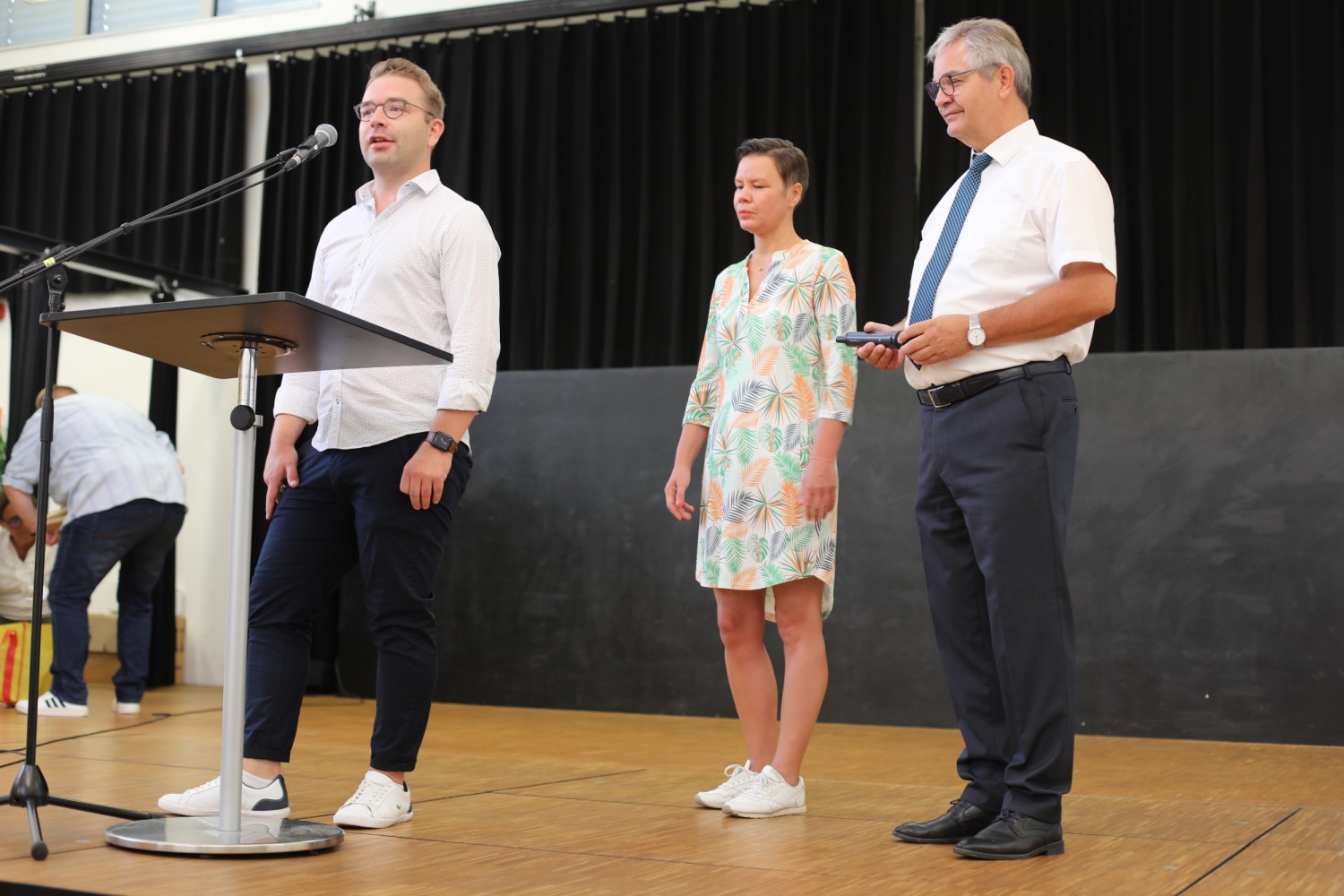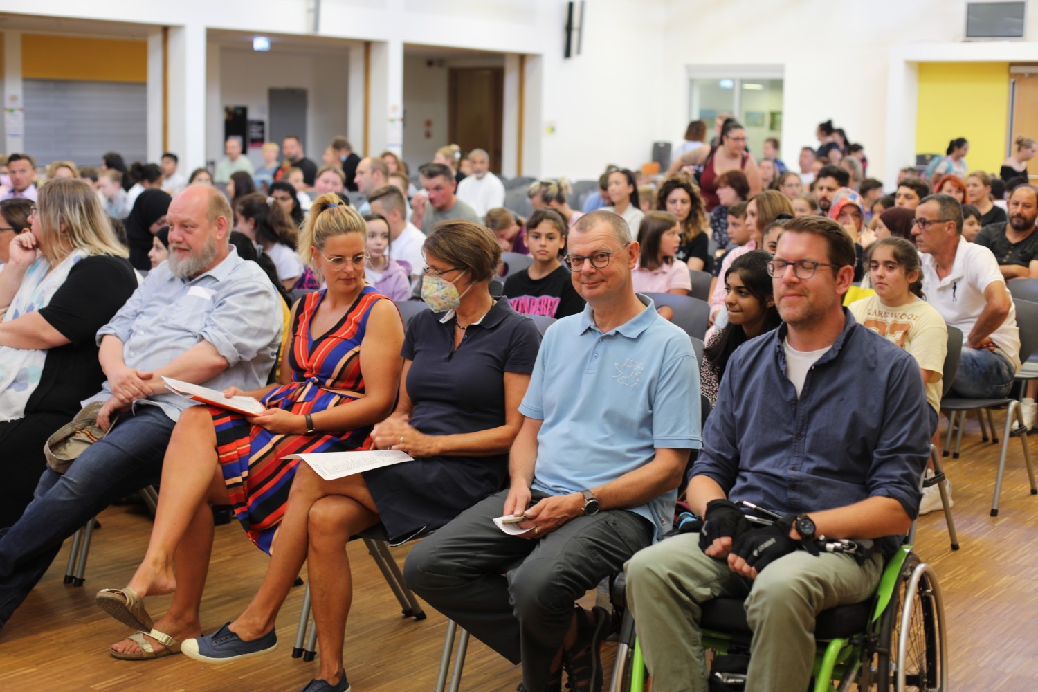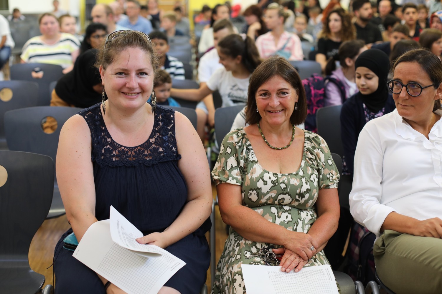 Danach wurde es für die ehemaligen Grundschüler so richtig spannend: Die neuen Klassenleitungen stellten sich vor und die neuen Klassen fanden sich auf der Bühne erstmals zusammen. Handys wurden gezückt und von den stolzen Eltern erste Fotos gemacht. Alles war ganz feierlich! Zu den neuen Klassen mit ihren Lehrkräften gesellten sich noch die neuen Paten, die ihre Schützlinge in den ersten Wochen und Monaten freundschaftlich begleiten werden. Dann konnten die neuen Klassenräume bezogen werden und der erste Unterricht an unserer Oberschule beginnen.
