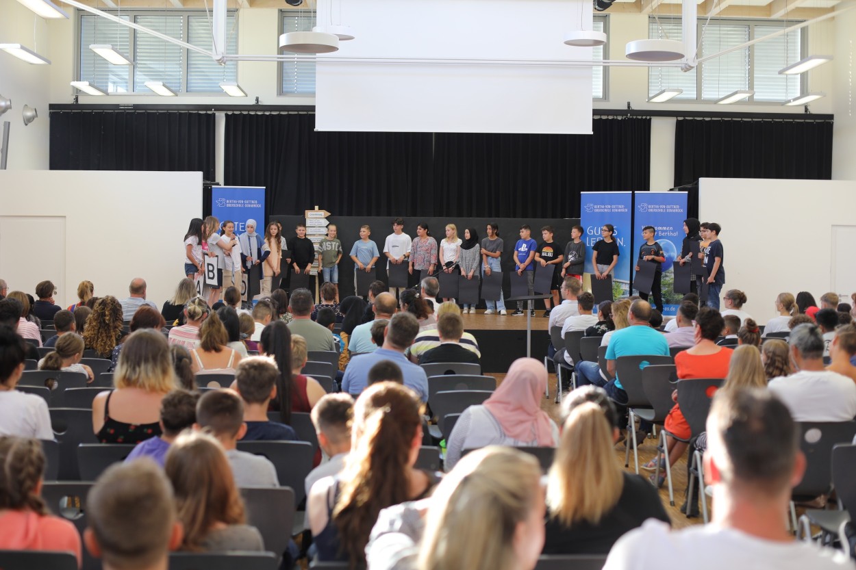 Wie man sich als Neuling fühlt, mit welcher Vorfreude, aber auch mit welchem leichten Kribbeln man am ersten Schultag in der neunen Schule ist - das konnten gut die jetzigen Sechstklässler nachempfinden und ihre "Nachkommen" mit einem bunten Showprogramm unterhalten und Mut machen. So wurden Lieder auf der Bühne vorgetragen und ein Begrüßungs-ABC präsentiert. Dass jeder ein wichtiger Teil des Ganzen ist, unterstrich die Klasse 6a, die entsprechend ein großes Puzzle zusammenfügte.