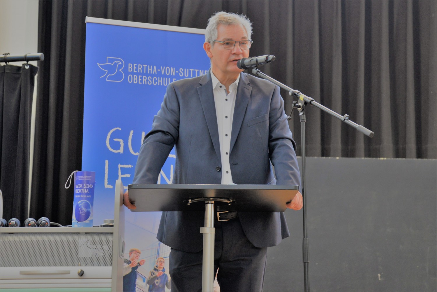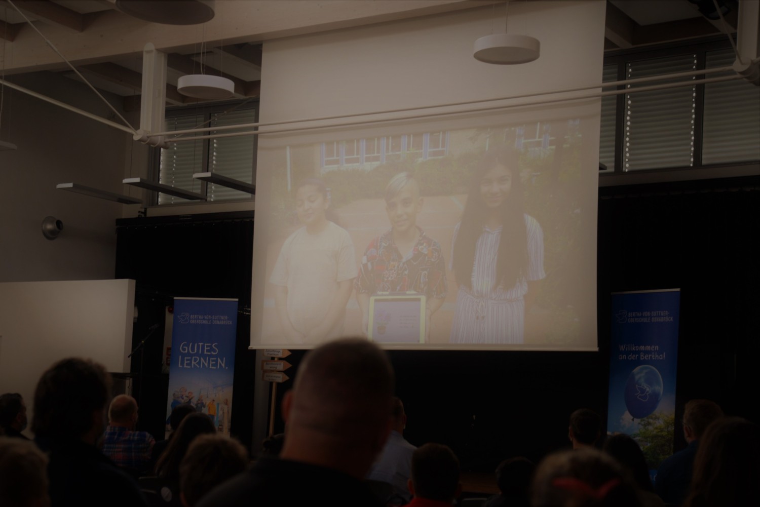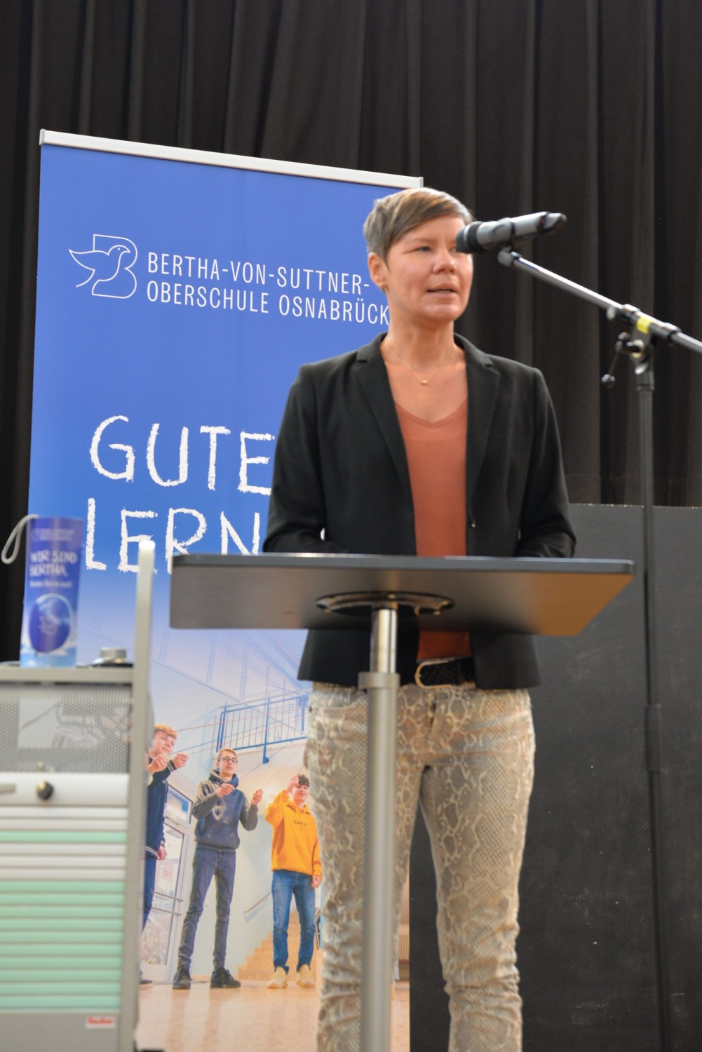 Unsere neue Aula bot den neuen Fünftklässlern und deren Eltern nicht nur genug Platz, sondern präsentierte sich auch als ein angemessener Ort für diese wichtige Feier am Schuljahresbeginn. Schließlich starten nun die ersten Oberschülerinnen und Oberschüler an unserer Bertha, und unserer Oberschule wird somit ihr Lebensatem eingehaucht.
