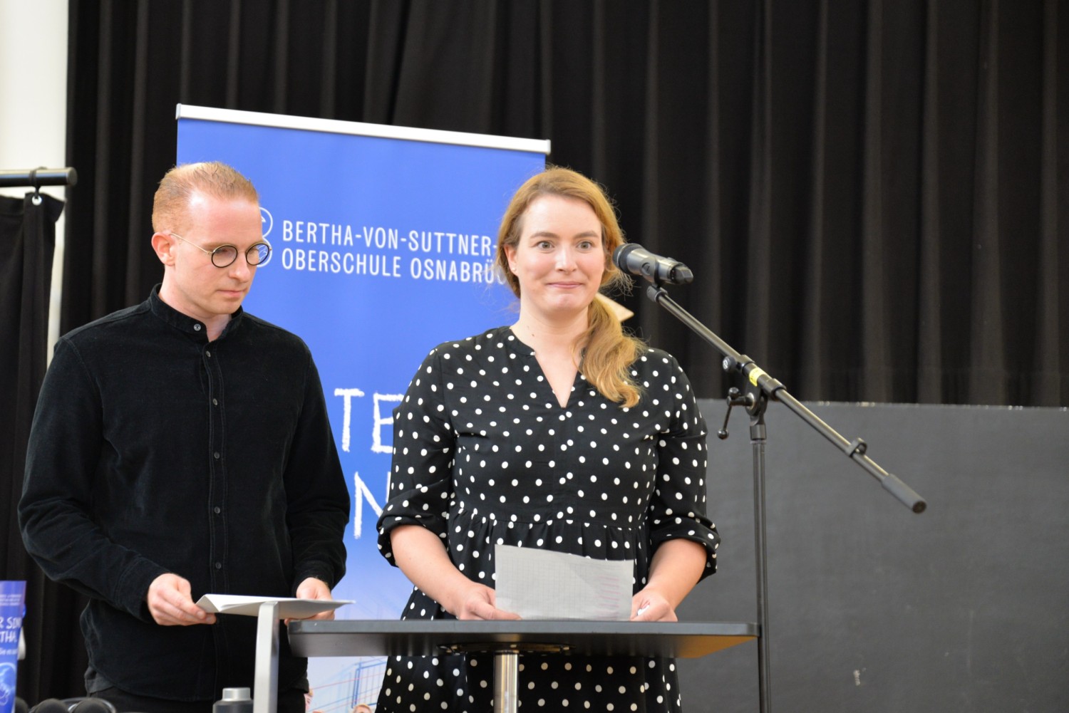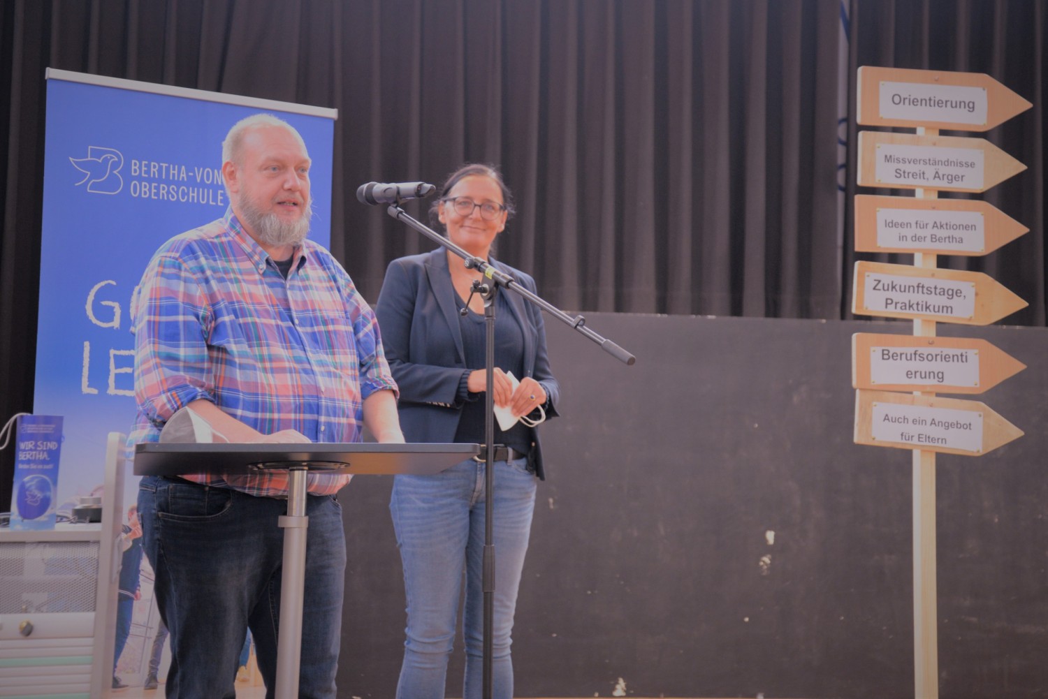 Weiter nutzten Frau Bleiker und Herr Cordes diese Feier, um sich als Beratungsteam vorzustellen, dass jederzeit unterstützend bereit steht. Als Symbol benutzten sie dabei einen Wegweiser aus Holz. Sehr einprägsam! Außerdem gewährten die Beiden einen ersten Eindruck in die Berufsorientierung an der Bertha!