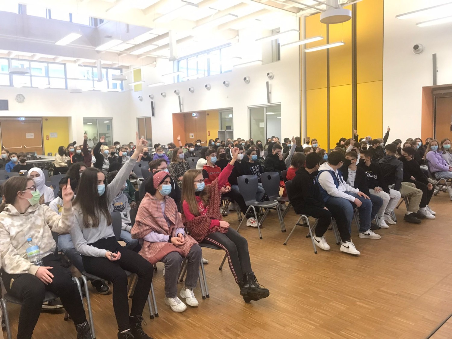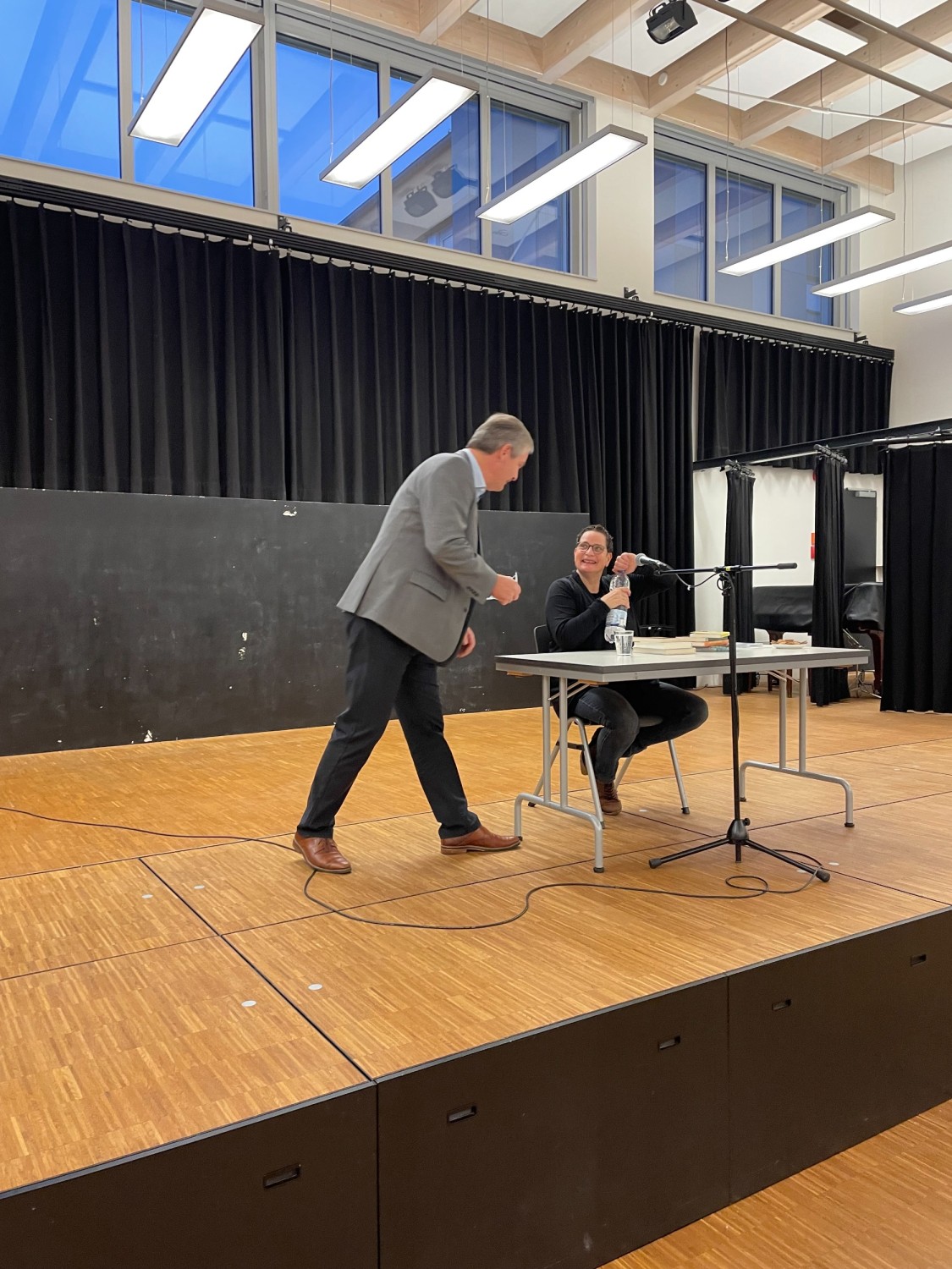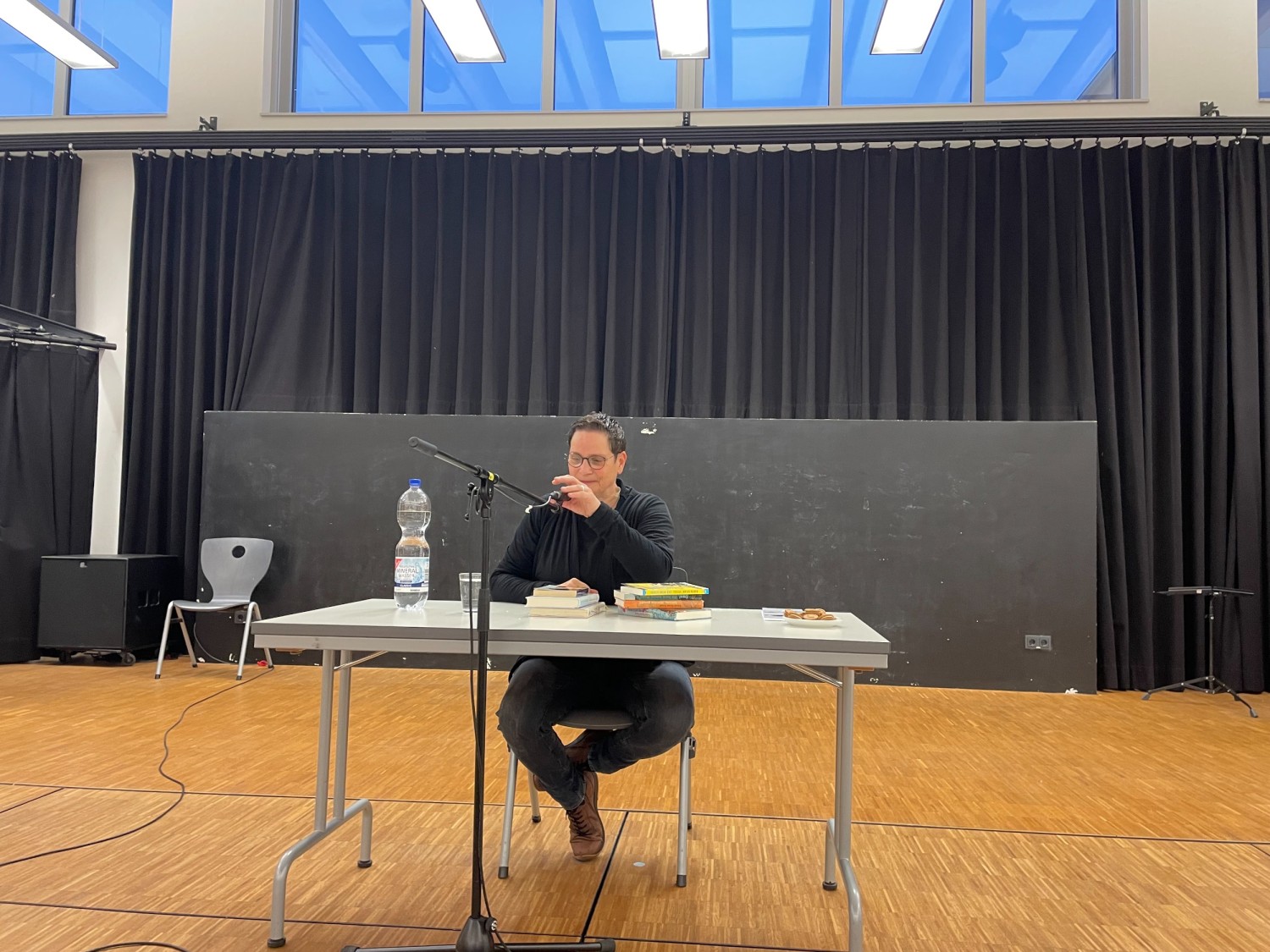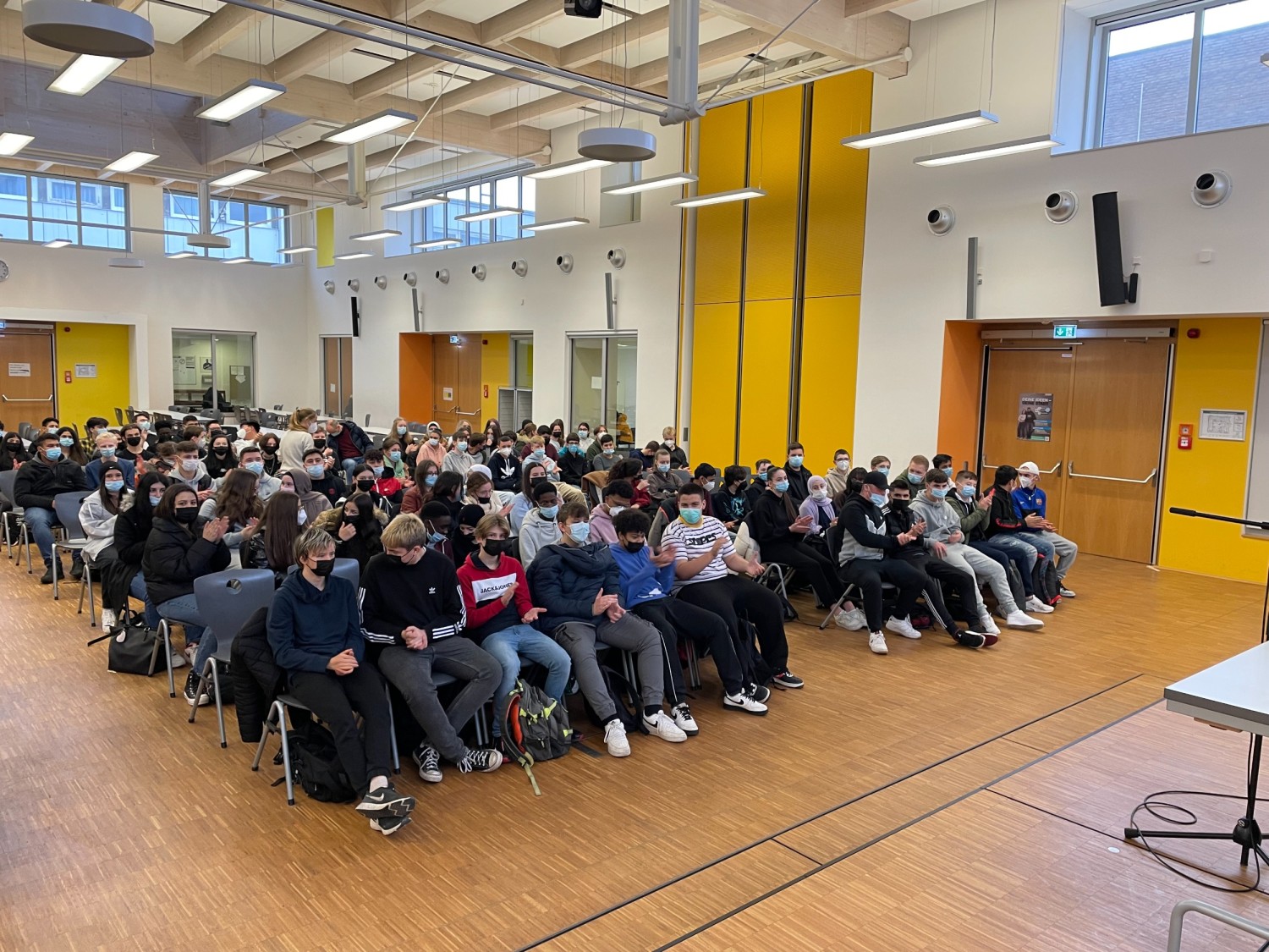 In der Aula der Bertha-von-Suttner Oberschule sitzen knapp 200 Schülerinnen und Schüler mit ihren Lehrkräften und warten gespannt auf den Beginn der Lesung mit der Schriftstellerin Karen-Susan Fessel.