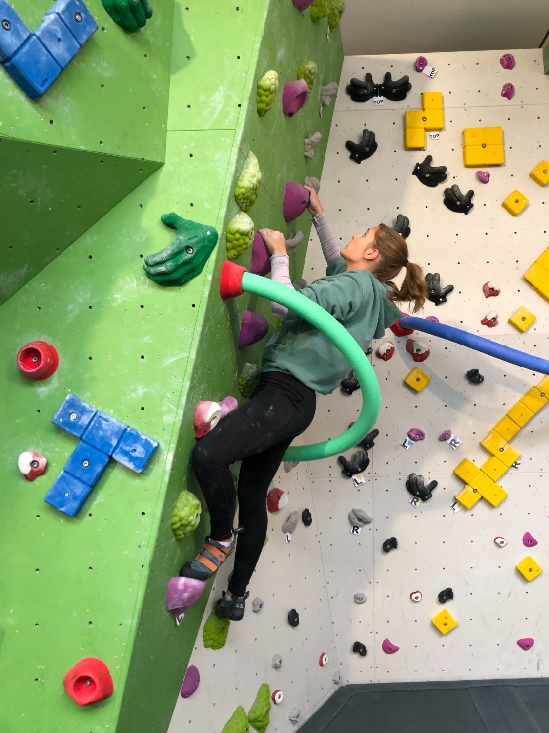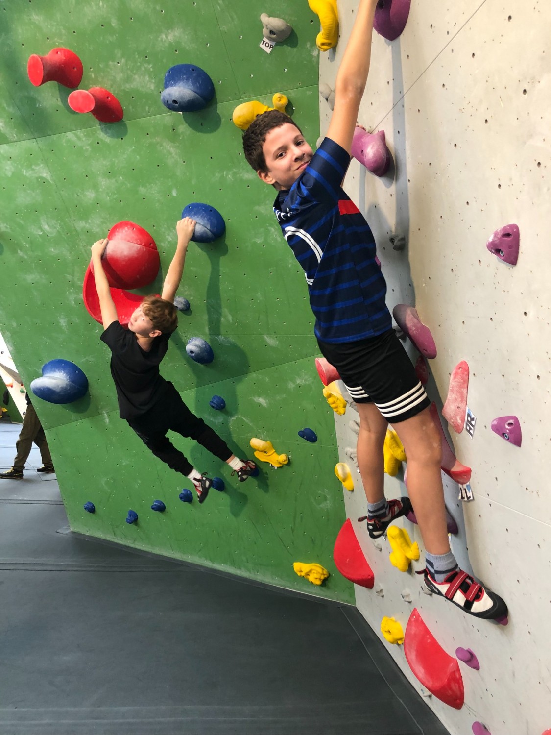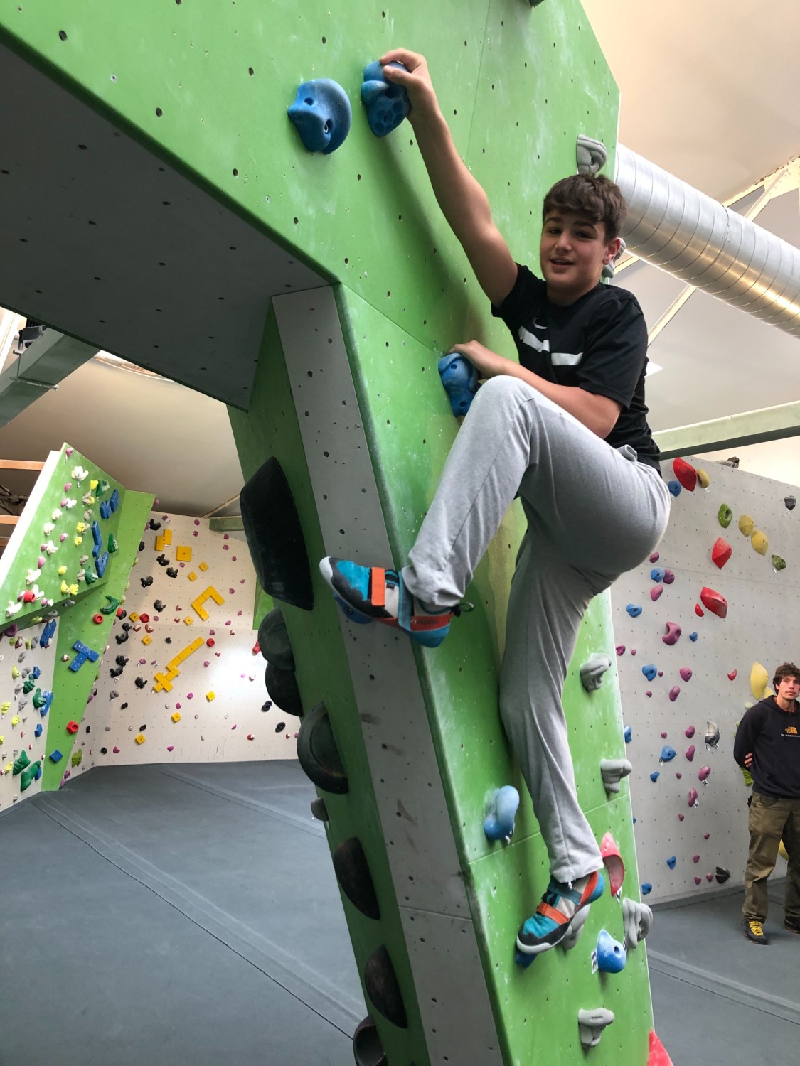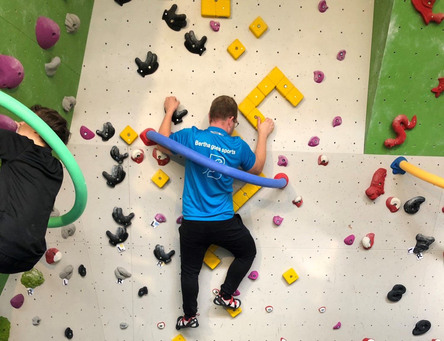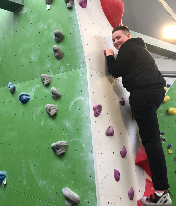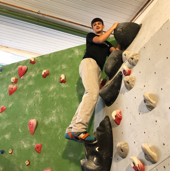 Beim Bouldern die eigenen Grenzen überwinden, zusammen im Team miterleben, wie Teilnehmer*innen weiterkommen und die eigenen Grenzen verschieben - das gehörte zu den besonderen und persönlichen Erfahrungen der Schüler*innen des Boulderprojekts. In ungefährlichen, aber doch schon leicht schwindeligen Höhen konnten die Jugendlichen unter der Anleitung von Teamern und gemeinsam mit ihrem Lehrer in Absprunghöhen klettern und so Zug um Zug, ohne Sicherungsseil entlang der Kletternwand der eigenen Route folgen. Dass hier nicht bloß Kraft und Geschick, sondern auch Köpfchen gefragt ist, konnte auch der begleitende Naturwissenschaftslehrer, Herr Fißmeyer, berichten. Er erinnerte hier kurz an die Hebelgesetze aus der Physik und ließ sich auch nicht nehmen, sich selber aktiv mit demTrainingsgerät zu beschäftigen.